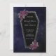Dark and beautiful, this coffin wedding invitation is perfect for a gothic or Halloween wedding. Coffin has grey glitter sparkle around the edges and purple roses with gold and grey green leaves. See our coordinating gothic items.