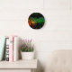 Cool, trendy and modern mechanics theme. Black background colour. Cogwheels making an abstract pattern. Bright neon colours, blue, green, yellow and Orange. With orange and green clock face numbers.