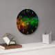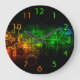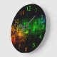 Cool, trendy and modern mechanics theme. Black background colour. Cogwheels making an abstract pattern. Bright neon colours, blue, green, yellow and Orange. With orange and green clock face numbers.