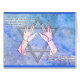 The beautiful, dignified original design on this over-sized card for the High Holidays incorporates a subtly tiled Star of David topped w/ pink lilac shaded "Cohanim Hands" that appear to be engraved in a beautiful rock wall tinted w/ blues from Monet's palette. On front, in both English & Hebrew is one of the Priestly Blessings for Rosh Hashanah. Text inside is transliteration of traditional holiday greeting that you can keep, change, or clear.