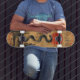 This captivating skateboard design features a coiled serpent winding through a desert landscape, silhouetted under a striking red moon. Symbolising mystery and resilience, this design captures the intense spirit of the wilderness. Inspired by the retro travel posters of the 1950s, it uses a palette of warm desert tones, deep shadows, and bold red accents to evoke a timeless, adventurous feel. Perfect for skaters who resonate with the wild and untamed spirit of nature, this artwork is an ideal blend of vintage aesthetics and modern skate culture.
