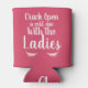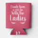 Pink and white "Crack open a cold one with the ladies" script can cooler with cute eyelashes design. The bottom features a personalised monogram letter.