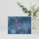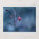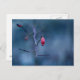 Postcard with a closeup photo of an old frozen red rose fruit, on a blue bokeh background. Customisable.