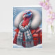 Turkey wearing a red jacket and scarf in snowflakes.