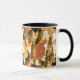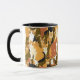 Mug in a collection of cute cats, in different shades of orange, black, and white, arranged against a warm brown background. Small hearts and floral accents are interspersed throughout, adding a whimsical touch.