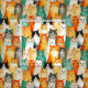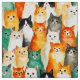 A collage of cats in various shades of orange, white, grey, beige, and black and white. Each cat has a distinct expression, ranging from curious to content. The watercolor style and repetition creates a lively, playful pattern.