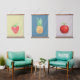 "The collection of fruits" (Strawberry, Pineapple, and a Red Apple) are minimalist watercolor paintings. The colours are pastel and look like a watercolor painting. This print will brighten up any kid's bedroom or playroom.