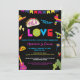 Colourful Taco Bout Love Mexican Fiesta Couple's Shower - This festive and colourful couple's shower invitation is perfect for the couple wishing to have a taco party celebration with margaritas! Features colourful watercolor images of a taco, margarita, pinata, Mexican bunting banner, sombrero, maracas, cactus, guitar, limes, and nachos in shades of blue, pink, red, green, yellow and purple, and a black background.