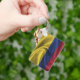 Keychain with the flag of Colombia in wavy fabric style design. This design features the Colombia flag colours and design with a beautiful waving material textured effect. This flag design is a great way to show you are proud to be from Colombia.