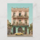 Classic picture from Havana the capital city in Cuba. A colonial old building with a yellow vintage car parked in front of it