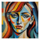 This cubist painting depicts a female face fragmented into colored geometric sections. The facial features are defined by bold black contours, while bright shades of blue, red, yellow and green create a dynamic contrast. The style evokes Picasso's influence with his decay of shapes and his expressive palette, suggesting different perspectives and simultaneous emotions.
