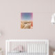 This full-color poster features a monolithic wall of boulders in Joshua Tree National Park. The foreground of this California desert is speckled with green bushes and agave, all accented by pink saturated light flares, creating a beautiful and hip piece of art for any modern home or dorm.