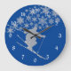 Any snow skier who enjoys the spectacular winter slopes in Colorado, will love this beautiful clock! It features a silver downhill skier in front of a spray of silver snowflakes. White perimeter numbers make the clock easy to read The image and numbers are placed on a deep blue background.