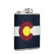 This hip flask features a scratched up, worn-out rendition of the state flag of Colorado. The red c represents the muddy earth enveloping a piece of yellow gold, with a white stripe on a field of blue. This is a great case for a Coloradan.