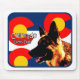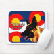 Graphic art depiction of a German Shepherd dog against the backdrop of a stylised Colorado flag