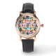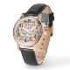 This woman's watch has a mid-century modern design of sets of three leaves in fading shades of retro colors.