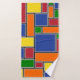 This towel set has a Bauhaus design of rectangles formed with gray lines and filled with red, yellow, orange, blue, and green on a field of black.