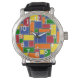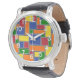 This watch has a Bauhaus design of rectangles formed with gray lines and filled with red, yellow, orange, blue, and green on a field of black.
