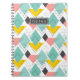 Colorful abstract retro shapes 90's pattern, notebook. Notebook features abstract colorful diamonds and triangles in gray, pink, yellow and teal pattern with a single template text line for name or other text on matching gray label.