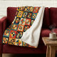 A sherpa blanket featuring a colorful geometric tiled pattern in vibrant colors.