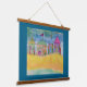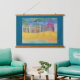 Vibrant beach huts are illuminated n this hand-painted artwork, with their roofed-flags and surfboards, a most colorful mixed media presentation.