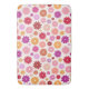 Colorful flower pattern in yellow, orange, pinks, lilac and reds on a cream color background.