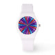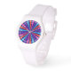 A vibrant bold colorful multicolored sun burst style graphic decor on a fine custom fashion watch.