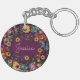Pretty yet uniquely chaotic floral pattern in vivid colors on personalized keychain.