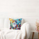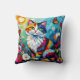 A sweet throw pillow with a cute illustration of a colorful abstract cat surrounded by flowers, butterflies and the sun in a paper quilling impasto style.