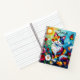 A sweet personalized notebook with a cute illustration of a colorful abstract cat surrounded by flowers, butterflies and the sun in a paper quilling impasto style.