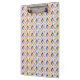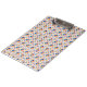 Colorful clipboard with geometric pattern featuring orange, blue, and yellow elements on white. Shown from front and left side, creating a vibrant visual appeal.