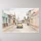 Bring timeless charm and nostalgic elegance into your space with this vintage Havana street watercolor painting, inspired by the iconic architecture and everyday life of historic Cuba. This artwork features a classic old car parked along a colorful colonial street, surrounded by pastel-toned buildings, textured facades, and delicate overhead wires that evoke authentic Old Havana city vibes.