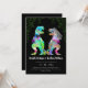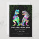 Delight your guests with this funny dinosaur-themed wedding invitation, featuring a charming T-Rex bride and groom in warm brown hues surrounded by lush green jungle foliage. Set against a sleek black background, this bold and modern design is perfect for couples who love dinosaurs and want to add a playful twist to their special day.