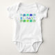 Stylish baby one piece romper, with colorful cartoon patterned elephants in two rows. Multi-colorful text, between the rows of elephants, reads Elephant.
