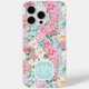 Customize this gorgeous modern colorful flower garden of flowers in pink, white, and yellow iPhone 15 pro max case with your your initials in a modern CAP font in white on blue. It's so vibrant and happy!
