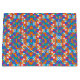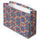 Colorful geometric gift bag with vibrant patterns in red, blue, orange, and white. The design features interconnected shapes, creating a lively, festive look.
