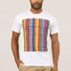 This vibrant geometric pattern t-shirt features a modern rainbow grid design that stands out beautifully on a clean white background. Perfect for casual wear, creative personalities, and anyone who loves bold, colorful fashion.