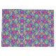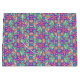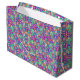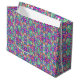 Colorful gift bag with intricate, vibrant floral and geometric patterns in purple, pink, and green tones; features white handles.