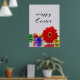 Happy Easter illustration featuring colorful foil wrapped chocolate Easter eggs and a red gerbera flower on a light white-grey background.