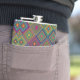 Colorful hip flask with a geometric diamond pattern. The vibrant design includes shades of pink, blue, green, and yellow, creating a lively, modern look.