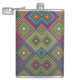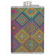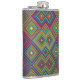 Colorful hip flask with a vibrant geometric diamond pattern in blue, yellow, green, and pink. The design creates a lively and energetic visual effect.