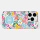 Customize this gorgeous modern colorful flower garden of flowers in pink, blue, orange, yellow and white iPhone 16 pro case with your your initials in a modern CAP font in white on blue. It's so vibrant and happy!