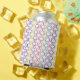 This can cooler has an art deco design of orange, turquoise, pink, blue, purple, and yellow half circles connect with lines on a field of white.