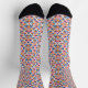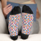 Colorful patterned socks with black heels and toes, featuring a vibrant geometric design of diamonds and crosses, evoking a playful and lively mood.