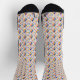 "Colorful patterned socks with geometric designs in blue, orange, and white. Black accents are visible at the toes, heels, and cuffs. Displayed from top and side views."