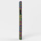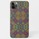 Colorful phone case with intricate geometric diamond pattern in vibrant shades of purple, green, and yellow. Visual focus on pattern complexity.