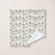 "Two images display a colorful rainbow-patterned towel set and washcloth. The towel set hangs neatly on a silver rod, while the washcloth is folded, exposing both its vibrant design and soft white lining, conveying a cheerful and cozy atmosphere."