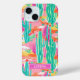 Customize this colorful watercolor iPhone 15 case featuring saguaro cacti with beautiful blooms in pinks and oranges with your name in a modern CAP font in white on pink. It's so modern and trendy!