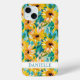 Customize this colorful modern sunflowers on teal painting iPhone 15 plus case with your your name in a trendy modern CAP font in teal on white. It's so beautiful and happy!