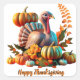 This sticker captures the essence of the Thanksgiving Day celebration with the image of a beautiful, colorful turkey amidst flowers and pumpkins. At the bottom the phrase "Happy Thanksgiving", which provides a touch of joy and gratitude. The turkey, with its vibrant and elegant plumages, blends harmoniously with the flowers and pumpkins, creating a scene that reflects the abundance and beauty of the fall season. This sticker is a lovely way to convey your best wishes and celebrate the occasion, perfect for decorating cards, gifts or any surface during this festive season."